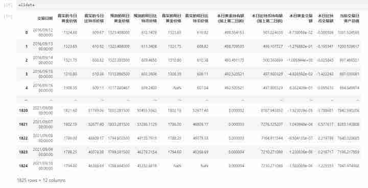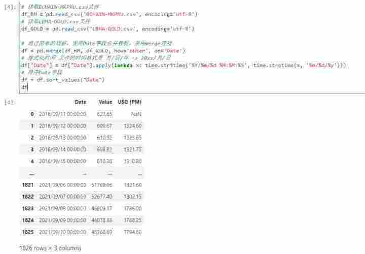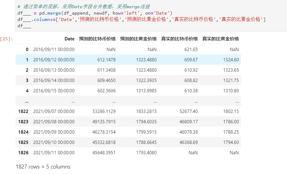 首先先把比特币和黄金的交易数据合并起来,通过简单的观察,以Date字段为关联字段,合并数据,采用merge连接,可以得到以下数据,可以看到,一共有1826行样本。