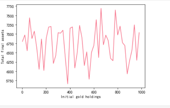 第三题的原理其实就是灵敏度分析,前面第一二题我们不是设置了初始黄金的持有量是一半一半各500,第三题灵敏度分析,它其实就是对这一些手动设置的参数进行分析,就像假设我黄金一开始持有量是100,会不会影响到最终的结果,所以我们可以看到那张图x轴是黄金开始的一个持有量,y轴就是经过5年交易期结束后的资产总额了,可以看到,他其实是再6750左右上下波动,说明模型的稳健性很强,对最终的资产总额结果不会有很灵敏的影响。