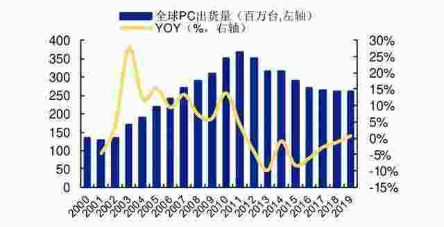 高歌猛进的增长势头,终止于2012年。Garter数据显示,2012年全球PC出货量减少1.2%,并在此后7年不断下滑,2018年的出货量仅为2.596亿台。直至2019年末,疫情这一“黑天鹅”的突然爆发,大大改变了人们的生活,居家办公、远程学习、在线娱乐兴起,这才给了PC市场逐渐回暖,重拾上涨势能的机会。