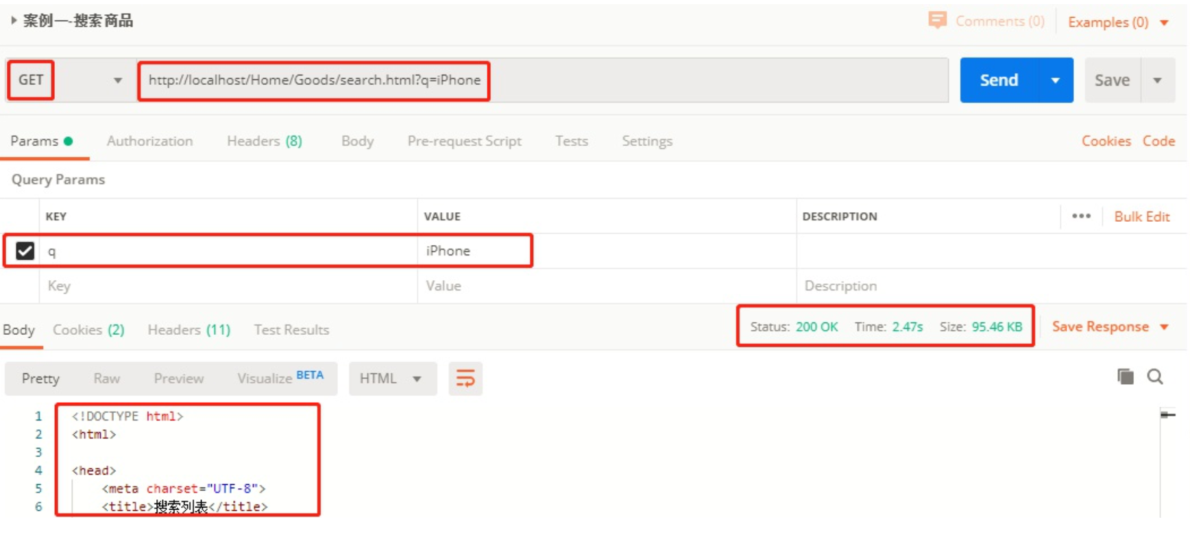 访问TPshop搜索商品的接口,通过查询字符串的方式传递搜索的关键字 iPhone ,并查看响应数据请求路径格式为: http://localhost/Home/Goods/search.html?q=iPhone1.2 实现分析