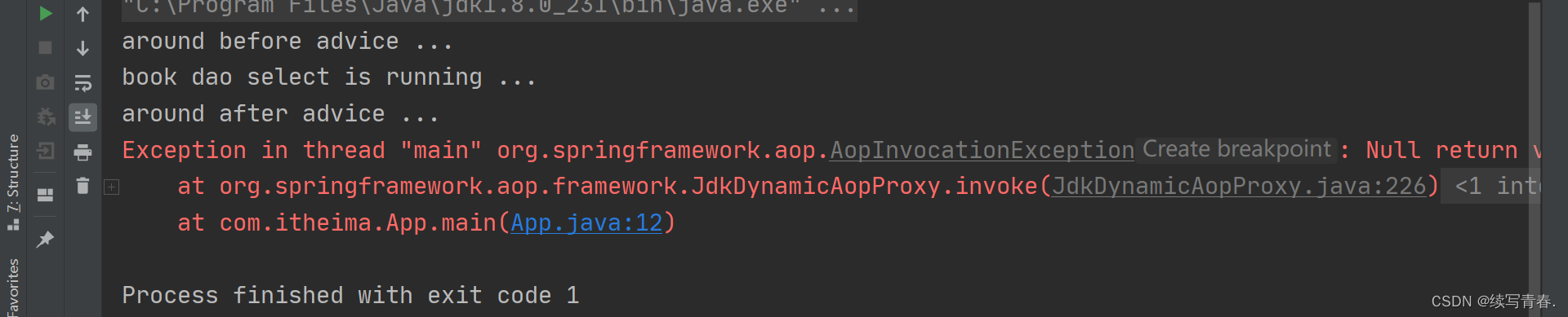 注意看,原始操作运行了嘛,运行了,环绕通知的前和后加上没有,加上了,但是最后抛了一个异常,这个异常是啥意思呢,解释一下,空的返回值从advice中出来了,它不匹配你的原始操作调用的返回值类型,原始操作的返回值是什么,是 int,那好解释一下这件事情,我们的环绕around对原始操作增强的时候,你记得原来如果没有返回值还好,但是如果原来有返回值的话,在环绕通知的最后边要将它的返回值扔出去,所以这个环绕通知的返回值也得改,改为什么呢,改为 Object,也就是返回一个对象,我们先返回一个200,运行一下,看程序有没有报错??。