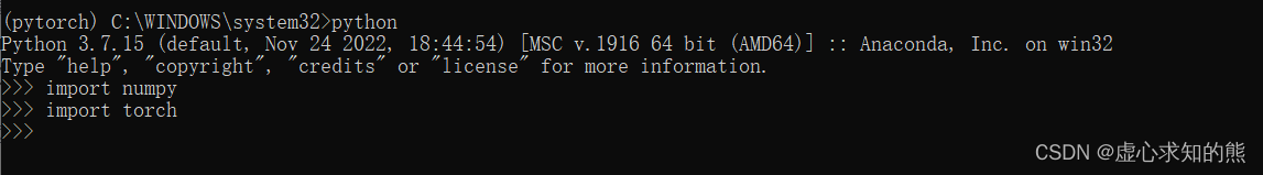 pip3 install torch torchvision torchaudio 跟 Anaconda 的问题相同,在官网上下载速度实在是过于缓慢,因此大家可以使用清华镜像源进行安装,此处就不过多叙述,本人直接官网下载安装的。(3) 在 PyTorch 下载完成后,对其是否安装完成进行测试。激活 PyTorch :activate pytorch进入 PyTorch :python测试 numpy:import numpy测试 PyTorch :import torch如果以上步骤都没问题,那么安装成功。