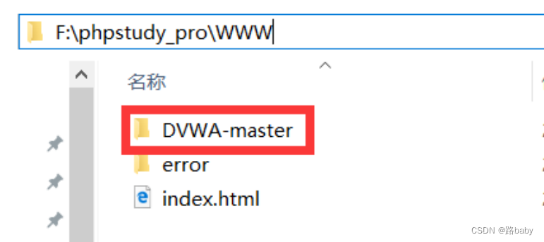 把下载好的DVWA的压缩包解压在之前安装PHPStudy文件夹下的WWW目录(先解压再复制到此目录也可以,注意 是把整个文件夹复制到此目录,而不是各个文件),如图: