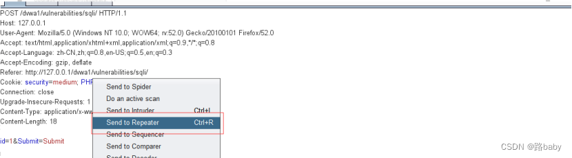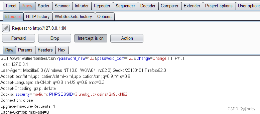 low级别未设置过滤,直接用bp抓包,可以清楚的看到dvwaSession的cookie,每重放一次,dvwaSesion增加1