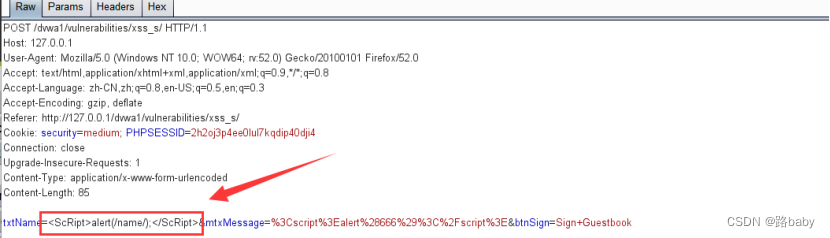 2)大小写混淆绕过,Burpsuite抓包改name参数为:<ScRipt>alert(/name/);</ScRipt>