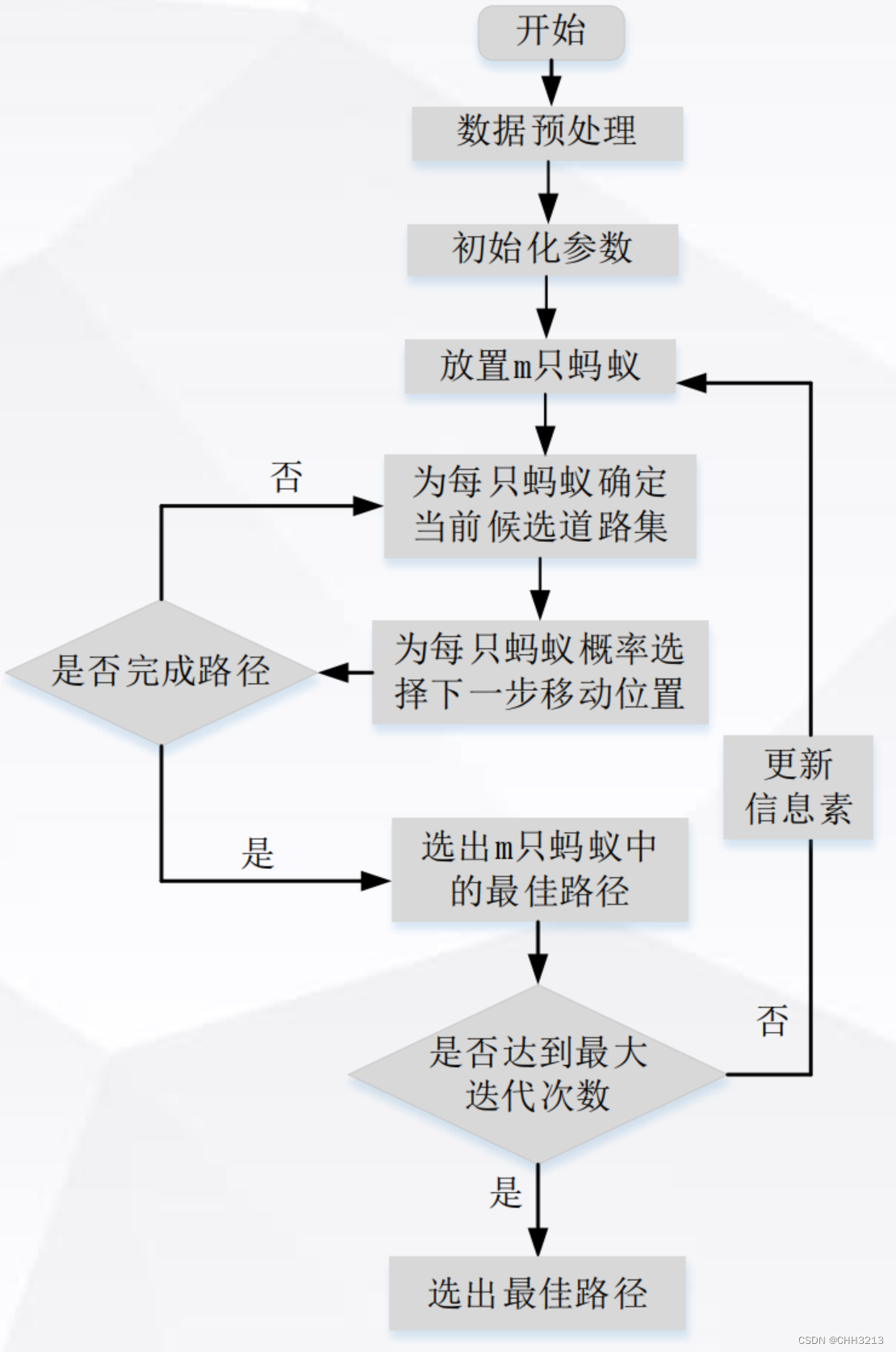 判断是否终止若 i t e r < i t e r m a x iter<itermax iter<itermax,则令 i t e r = i t e r + 1 iter=iter+1 iter=iter+1,清空蚂蚁经过路径的记录表,并返回步骤2;否则,终止计算,输出最优解。