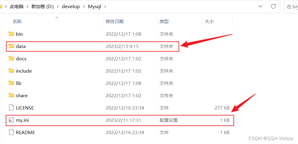 解压之后的文件里边是没有data文件的,需要创建一个空文件夹命名为data(后面需要用),并且需要创建一个初始化文件,命名为my,后缀名为.ini。my.ini文件以记事本方式打开输入以下配置设置信息