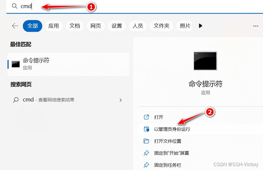 ①在任务栏的搜索框中输入cmd调出命令提示符,并以管理员身份运行