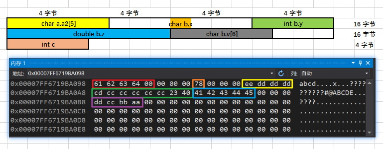 通常情况:我总结的规律如下:结构体中间:各结构体的起始地址按照各个类型变量默认规则进行摆放,但除了 char 类型变量(详见一),char 类型变量一般遵循 2 的倍数地址开始存储。详见例2。结构体最后(重要):视结构体中最大类型是哪一个,如果是像 int 类型那样是 4 个字节的,并且结构体的结尾地址不满足 4 的倍数的话,向离最近的 4 的倍数地址补齐;如果是像 double 类型那样是 8 个字节的,并且结构体的结尾地址不满足 8 的倍数的话,向离最近的 8 的倍数地址补齐;以此类推。。。。