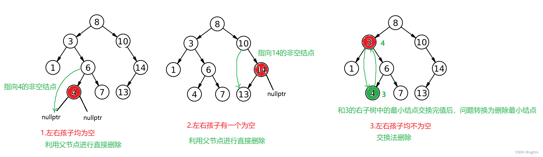 bool Erase(const K& val){Node* cur = _root;Node* parent = nullptr;while (cur){if (val > cur->_key){parent = cur;cur = cur->_right;}else if (val < cur->_key){parent = cur;cur = cur->_left;}else//找到要删除的结点了{if (cur->_left == nullptr){if (cur == _root)//删除结点是根节点{_root = cur->_right;}else if (cur == parent->_left)parent->_left = cur->_right;elseparent->_right = cur->_right;delete cur;}else if (cur->_right == nullptr){if (cur == _root){_root = cur->_left;}else if (cur == parent->_left)parent->_left = cur->_left;elseparent->_right = cur->_left;delete cur;}else{Node* minParent = cur;//minParent如果是nullptr,则当cur->_right是最小结点时,会发生空指针访问Node* minRight = cur->_right;//找右子树最小结点 或者 左子树最大结点while (minRight->_left){minParent = minRight;minRight = minRight->_left;}swap(cur->_key, minRight->_key);if (minRight == cur->_right)minParent->_right = minRight->_right;//右子树最小结点的左节点一定为空,让父节点链接其右结点即可。elseminParent->_left = minRight->_right;delete minRight;}return true;}}return false;} 3.递归版本