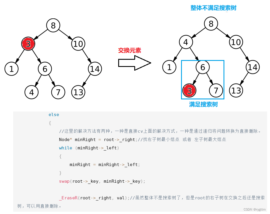 bool FindR(const K& val){return _FindR(_root, val);}private:bool _FindR(Node* root, const K& val){if (root == nullptr)return false;if (root->_key == val)return true;else if (root->_key < val)return _FindR(root->_right, val);elsereturn _FindR(root->_left, val);//return _FindR(root->_left, val) || _FindR(root->_right, val);//暴力查找就完事了} 3.4 Erase()删除结点(交换后整体不是搜索树,但结点的右子树是搜索树呀!)