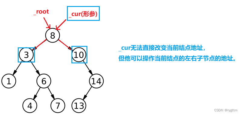 但这种思路有一个问题无法处理,那就是空树的情况,有人说,空树还不好处理吗?你直接new一个结点,将这个结点的地址给到形参root不就可以了吗?道理确实是这样的,但无法做到,因为root是一个形参变量,你将new出来的结点的地址给一个形参变量,函数外面的_root成员变量还是无法改变的,所以如果形参是普通的指针,则无法处理空树的情况。(这个道理其实就是上面判断root的左或右的问题,因为我们无法直接处理形参root当前指向的结点,因为root是形参,外面搜索树的实际结点无法被操纵,但我们可以处理root的左或者右,这个左或者右指向的就是外面搜索树的结点的左或者右)
