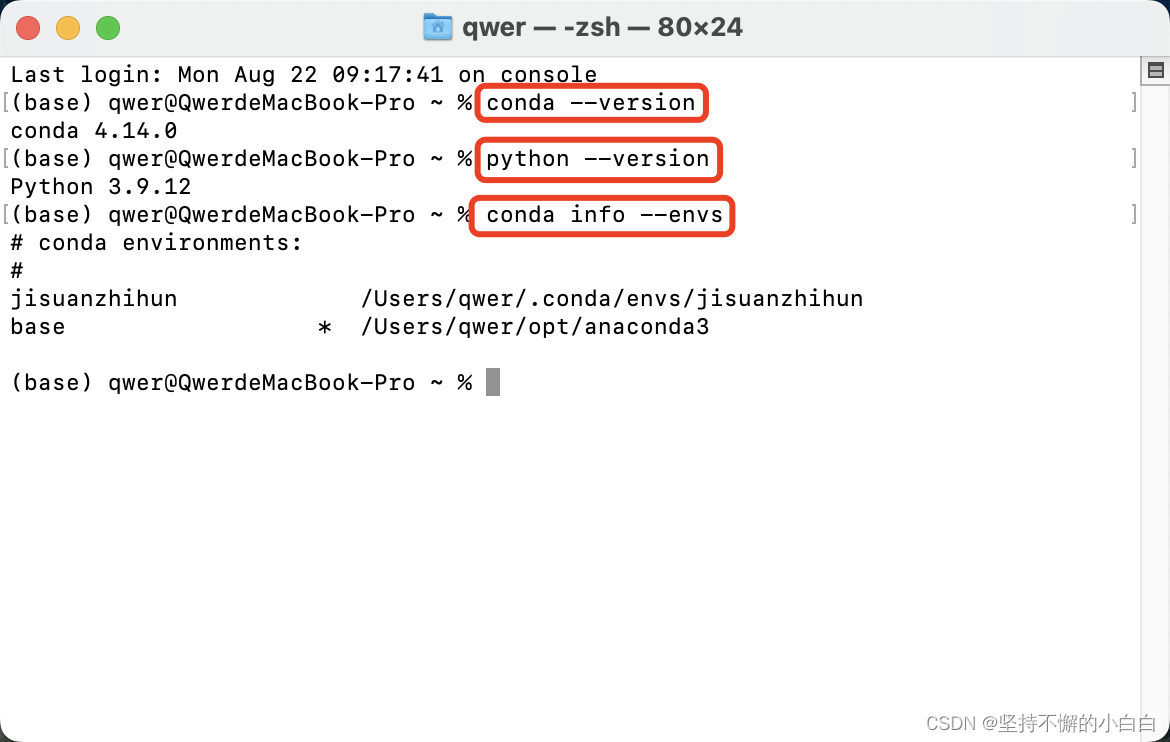 安装好之后打开终端,分别输入以下命令可以看到conda的版本、python的版本(这里是我之前安装过python)和已经创建的虚拟环境。