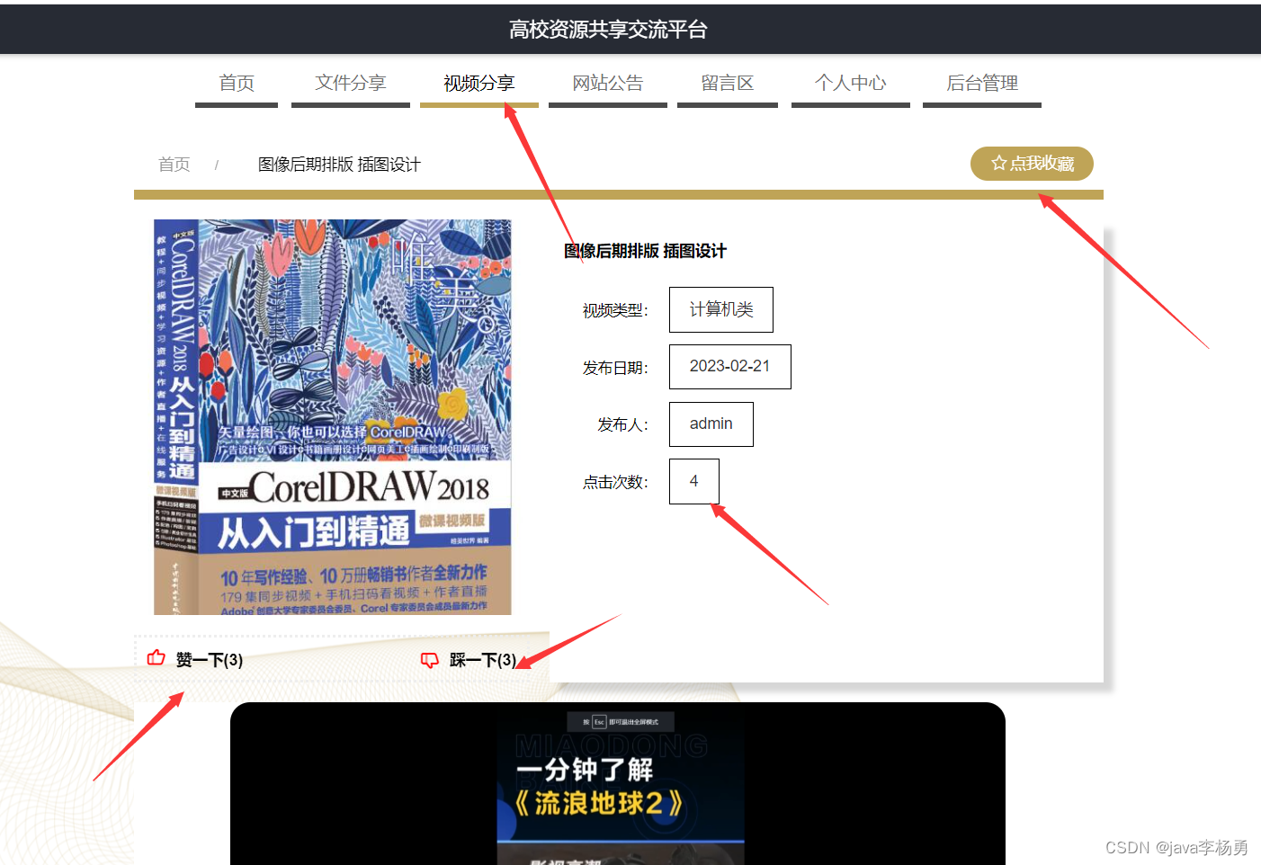 用户登录、注册、修改密码、首页信息展示、系统轮播图 、模糊搜索、收藏、点击数量统计、点赞、点踩、评论、详情、富文本图文上传、文件上传、下载、视频上传下载、文件资料、视频资料、公告信息、留言讨论区、加上一些基本业务功能的添加修改删除操作等