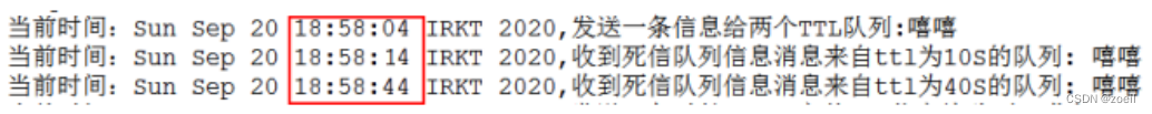 第一条消息在 10S 后变成了死信消息,然后被消费者消费掉,第二条消息在 40S 之后变成了死信消息,然后被消费掉,这样一个延时队列就打造完成了。 不过,如果这样使用的话,岂不是 每增加一个新的时间需求,就要新增一个队列 ,这里只有 10S 和 40S 两个时间选项,如果需要一个小时后处理,那么就需要增加 TTL 为一个小时的队列,如果是预定会议室然后提前通知这样的场景,岂不是要增加无数个队列才能满足需求?