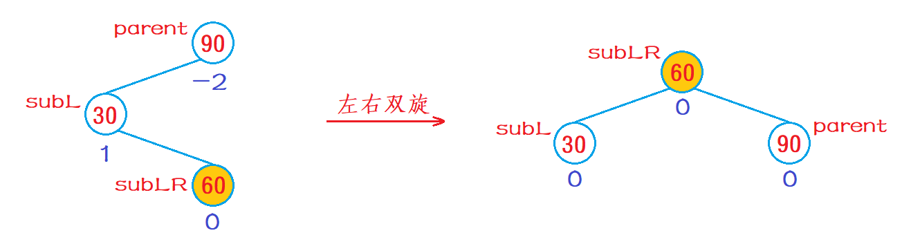 左右双旋后,实际上就是让subLR的左子树和右子树,分别作为subL和parent的右子树和左子树,再让subL和parent分别作为subLR的左右子树,最后让subLR作为整个子树的根(结合图理解)。