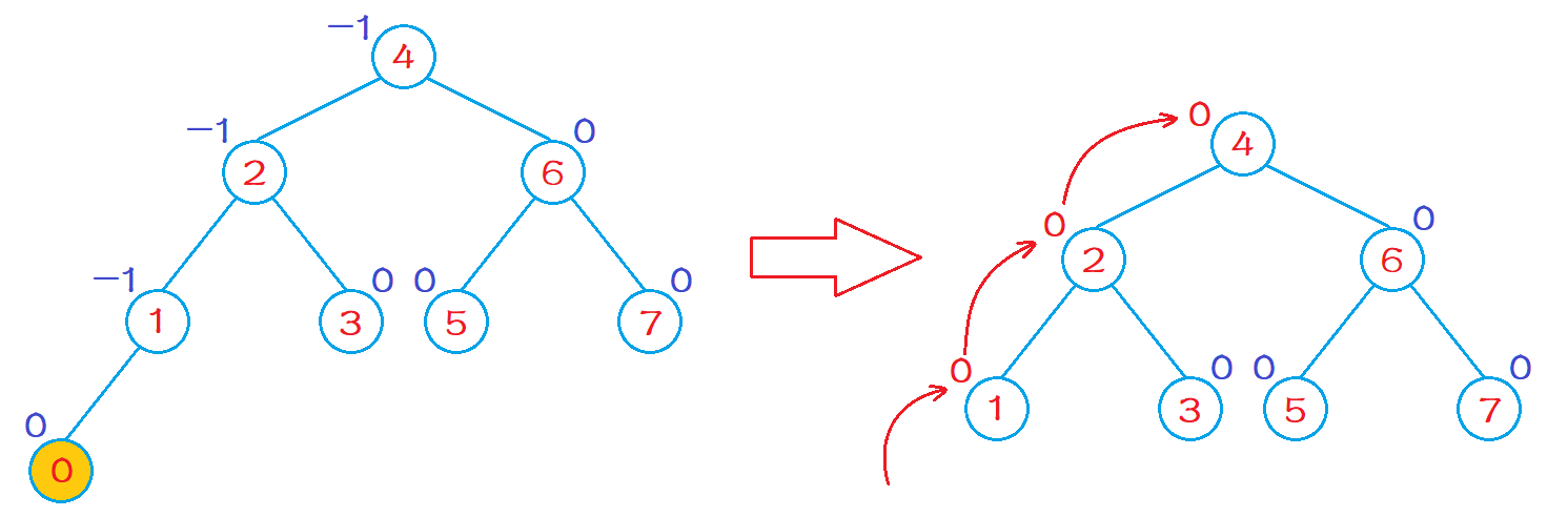| -1或1 | 只有0经过 − − -- −−/ + + ++ ++操作后会变成-1/1,说明新结点的插入使得parent的左子树或右子树增高了,即改变了以parent为根结点的子树的高度,从而会影响parent的父结点的平衡因子,因此需要继续往上更新平衡因子。 |