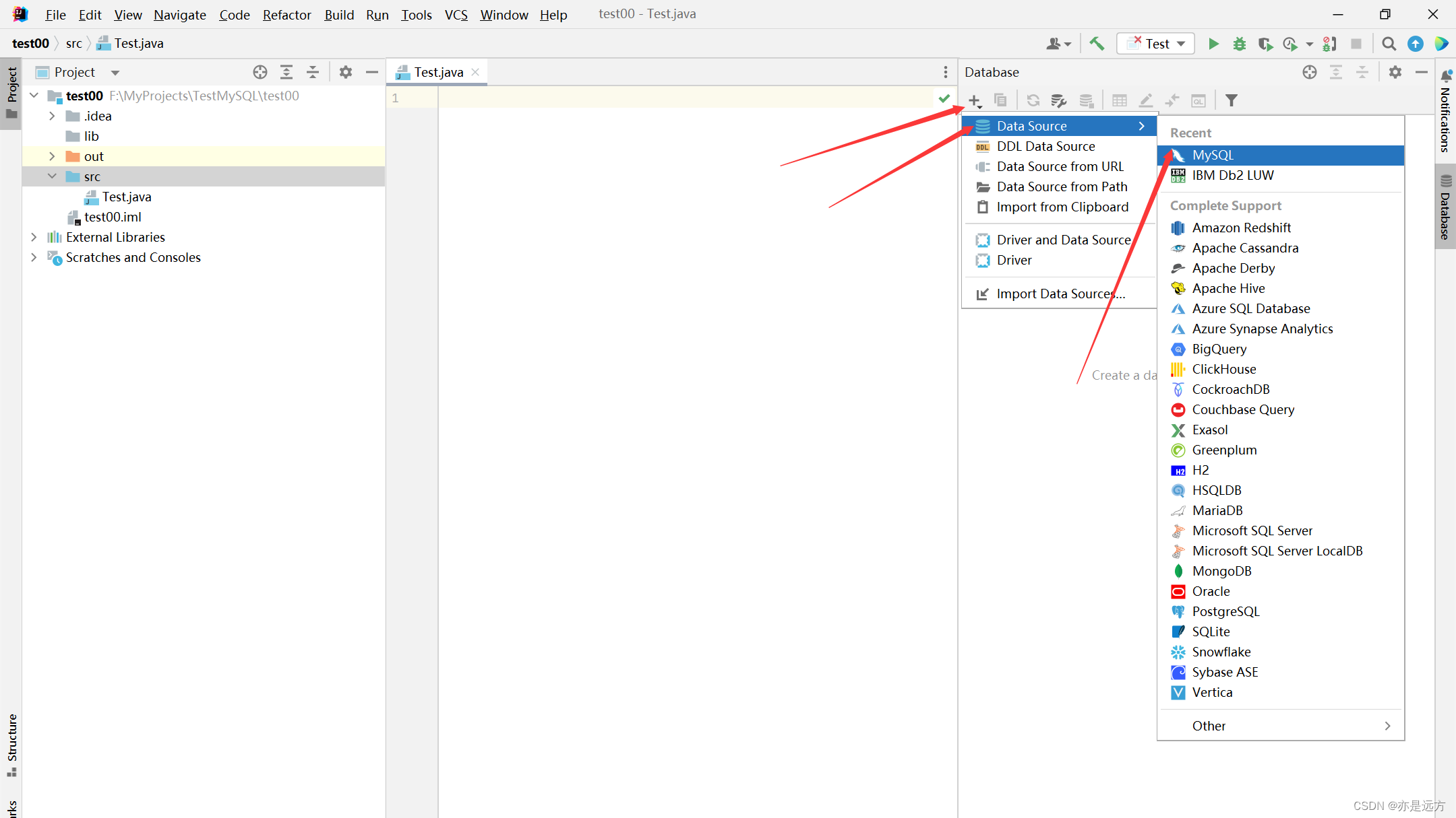 一、IDEA连接MySQL数据库(一)首先新建普通Java项目(二)连接数据库1、点击右侧DataBase2、点击加号,找到MySQL,添加数据库3、输入用户名和密码,点击**Test Connection**4、显示连接成功,点击Apply,OK5、发现没有数据库,点击**1 of 7**,选择**All schemas** 二、使用数据库的数据(一)新建Java类 Test(二)下载MySQL驱动Jar包方法一:官网下载方法二:百度盘 (三)返回IDEA,新建文件夹lib(四)非常重要(添加到库)右击加入的Jar包,选择**Add as Library(添加到库)** (五)编写Test类boss表结构如下(自己表结构要修改代码) (六)运行主函数,得到数据 三、更多好玩好学的内容请关注