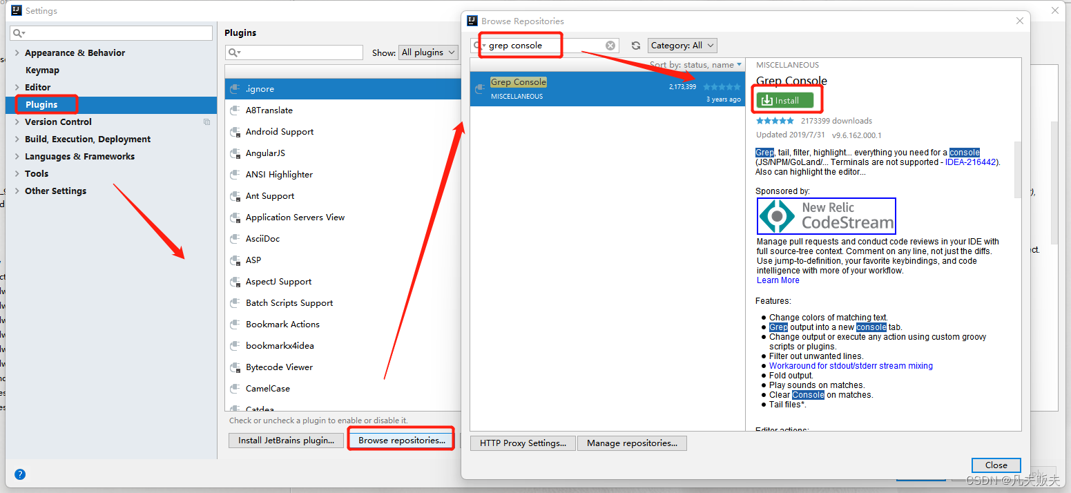 在线安装,需要可以连接到外网,file-->settings-->plugins-->browse repositories,在查询输入框中输入“grep console”,然后点击install,最后重启idea就可以使用了。