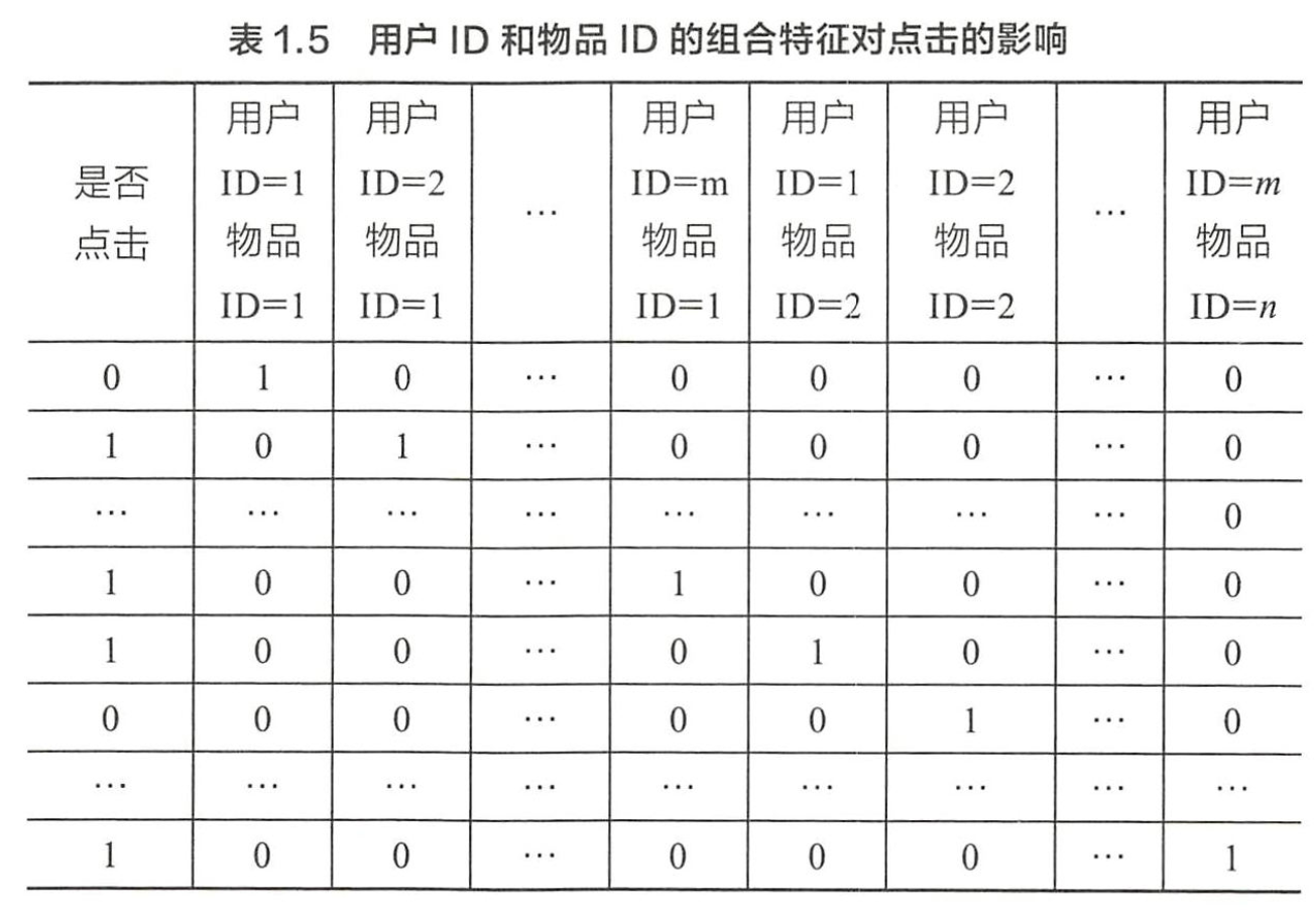 为了提高复杂关系的拟合能力,在特征工程中经常会把一阶离散特征两两组合,构成高阶组合特征。以广告点击预估问题为例,原始数据有语言和类型两种离散特征,下表1.2是语言和类型对点击的影响。为了提高拟合能力,语言和类型可以组成二阶特征,表1.3是语言和类型的组合特征对点击的影响。
