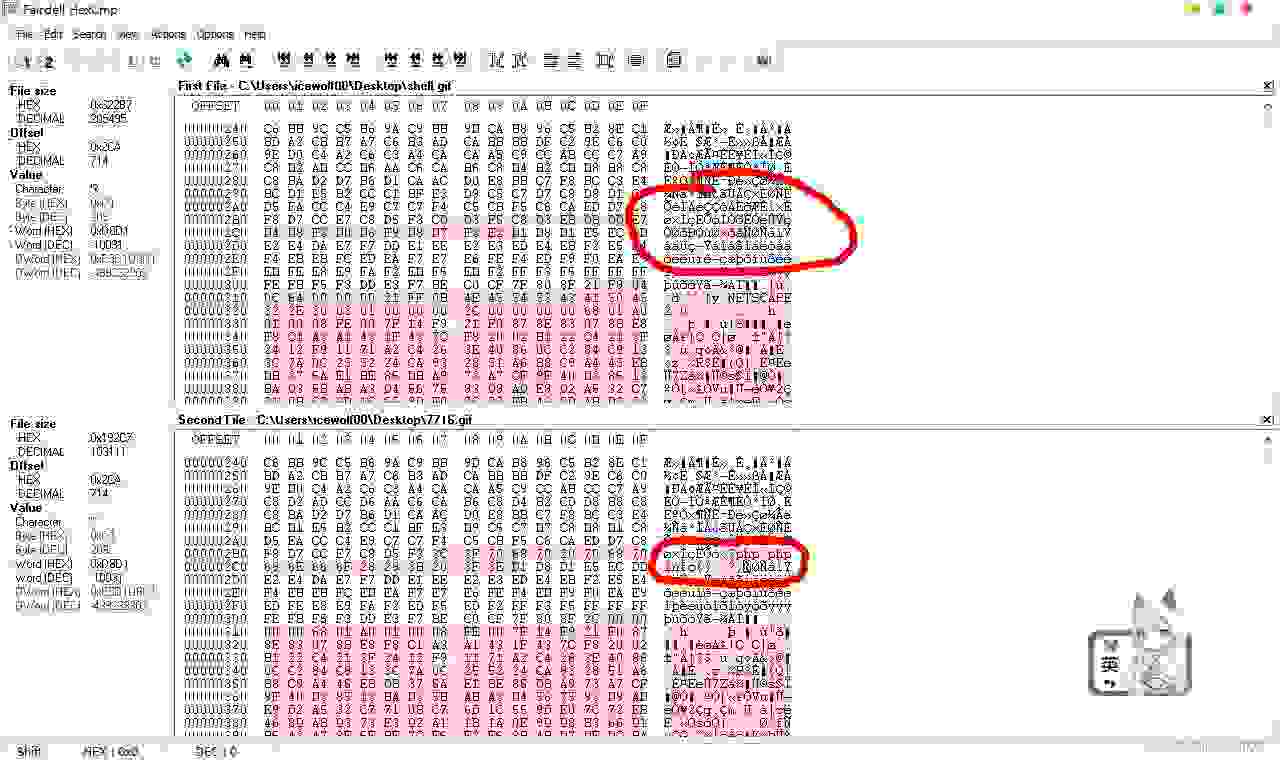 GIF图片绕过二次渲染较为简单。我们仅需要使用二进制工具比对上传前的图片(木马)和上传后(被渲染)的图片哪些地方没有改变即可。