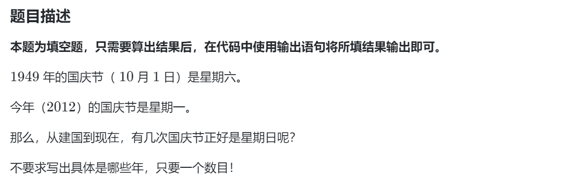 #模拟日期-星期几from datetime import *a=date(1949,10,1)b=date(2012,10,1)cnt=0while a<=b: if a.weekday()==6 and a.month==10 and a.day==1: cnt+=1 a+=timedelta(1)print(cnt)'''函数详解:date(year,month,day):格式转换函数:数字格式→日期格式a.weekday():星期几函数,默认从星期一开始(下标为0)a.month: 日历月份a.day: 日历天数timedelta(1):1天(时间单位)print(9)''' 模拟日期-含2天数⭐