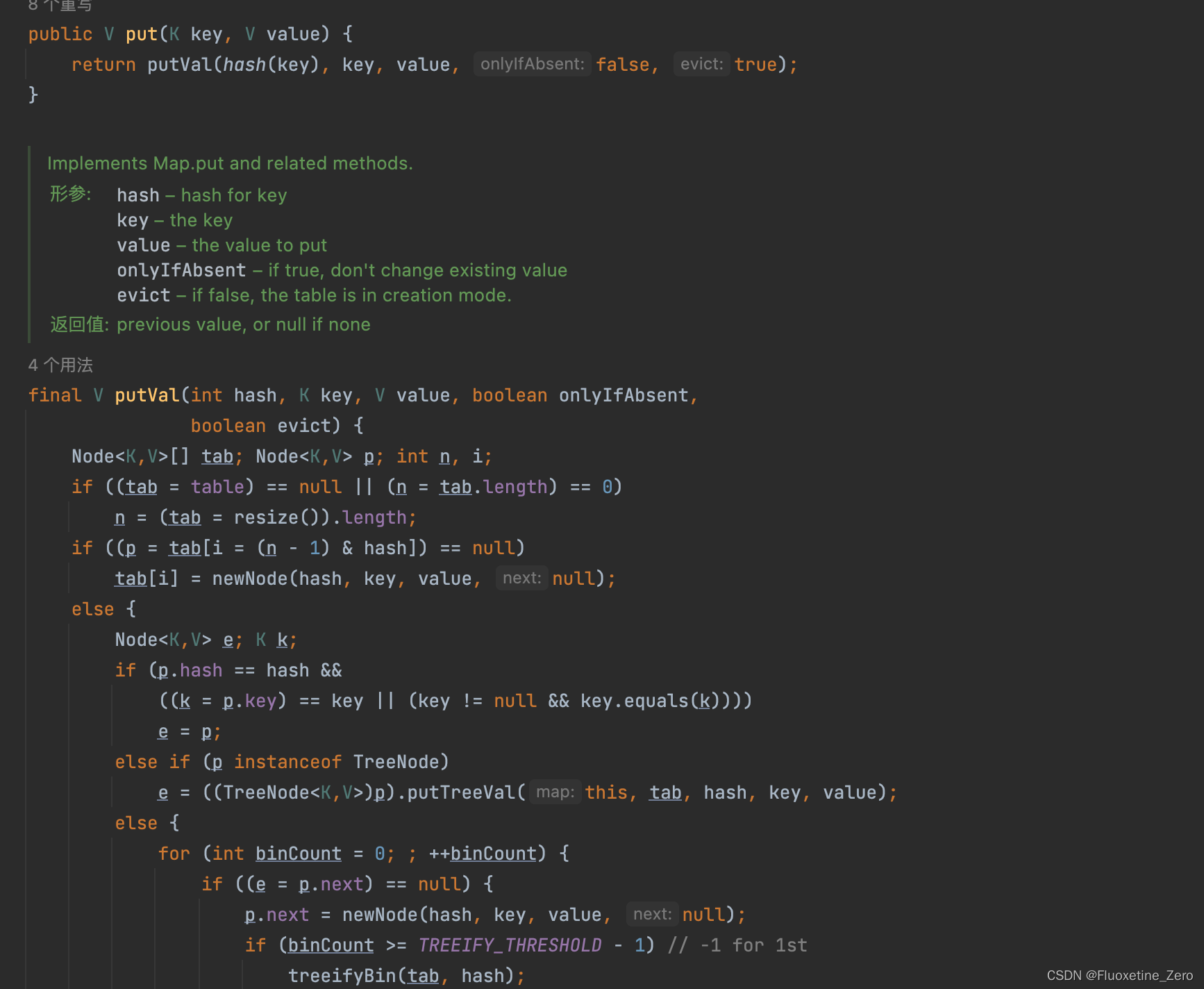 HashMap使用的是自定义的算法,当我们进入put方法查看时,看见put方法中return了一个叫putVal的方法,刚方法前面把这个key传进去又调用了一个叫hash的方法,这个是它自己的方法,点进去之后会发现,他又将这个key获取了一个hashcode,然后把它右移了16位,跟当前的hashcode做了一个异或。进入put方法