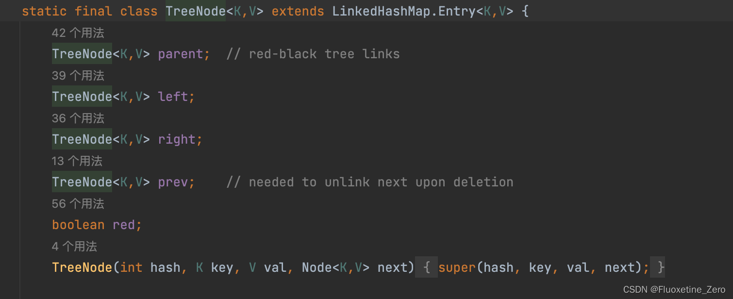 而TreeNode他存储的就不是了。而是当前节点的父元素、左元素、右元素,还有一个boolean类型的red(记录是否为红节点)。