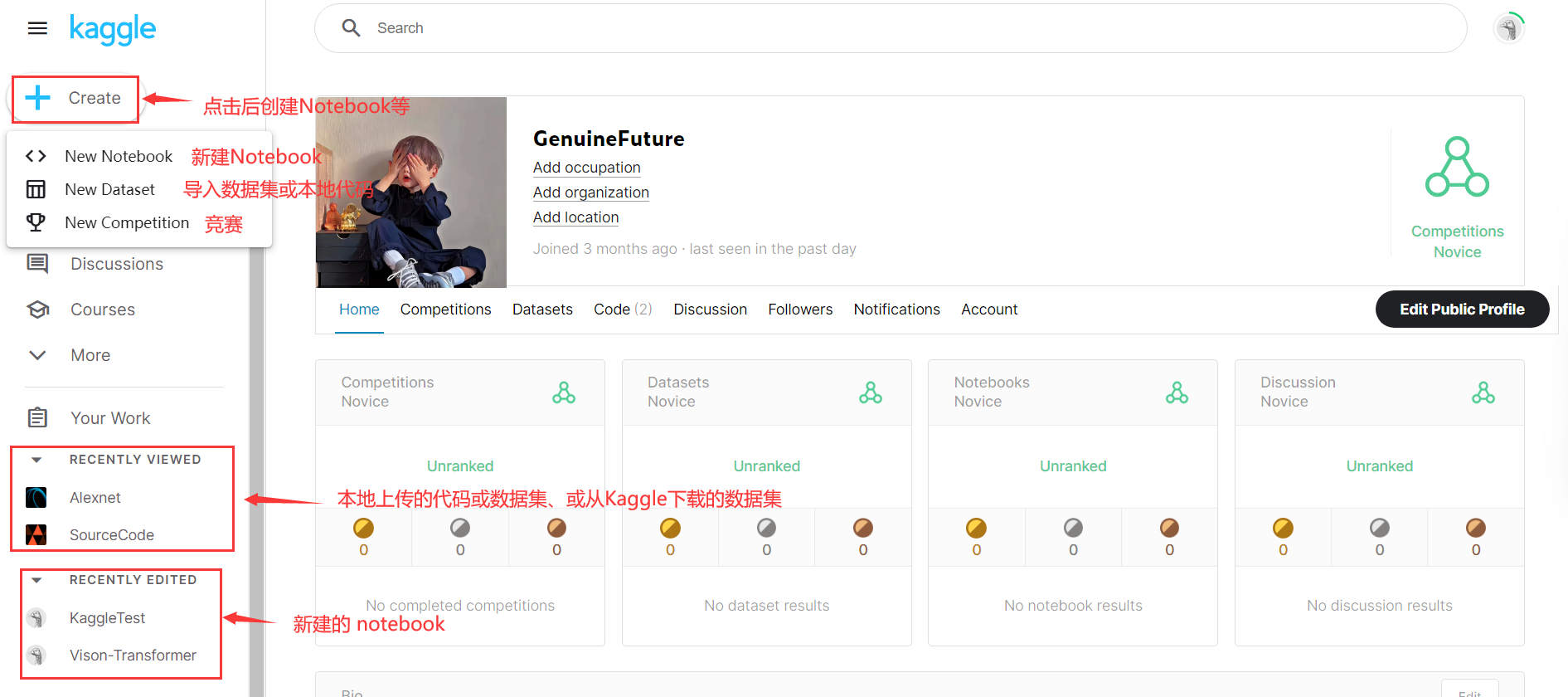 import osprint(os.listdir("../")) # ['lib', 'input', 'working'] print(os.getcwd()) # 当前文件所在的路径 /kaggle/workingprint(os.listdir(os.getcwd())) # 在 /kaggle/working 文件夹下有两个隐藏文件['.ipynb_checkpoints', '__notebook_source__.ipynb']print(os.listdir("../../")) # print(os.listdir("../input")) # 查看自己导入的文件print(os.listdir("../../kaggle")) 一、将本地项目上传到 Kaggle 并运行