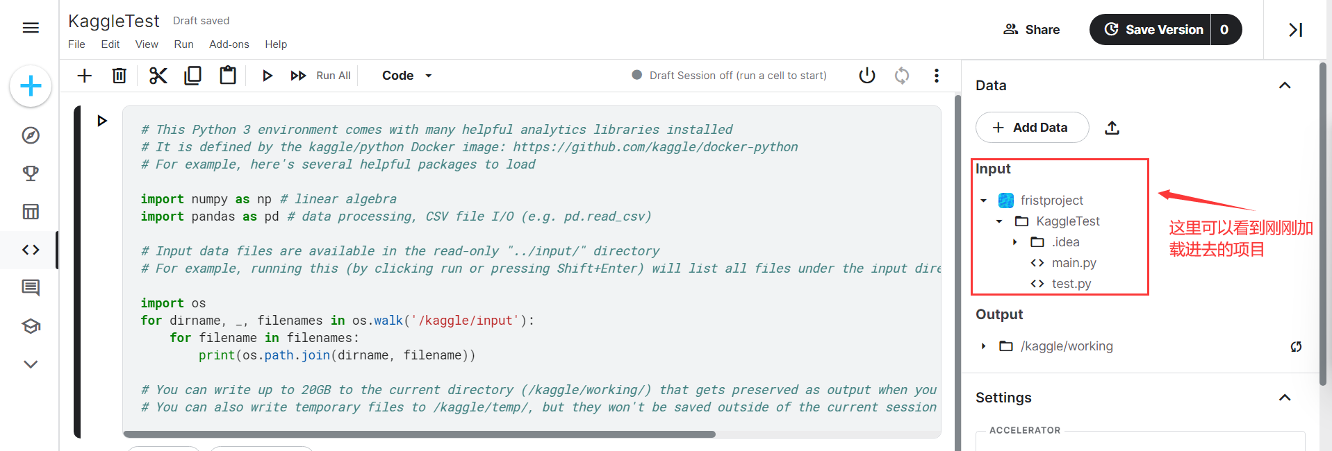 最开始新建会出现 Kaggle 自带的代码,运行后可以读取所有文件的路径# This Python 3 environment comes with many helpful analytics libraries installed# It is defined by the kaggle/python Docker image: https://github.com/kaggle/docker-python# For example, here's several helpful packages to loadimport numpy as np # linear algebraimport pandas as pd # data processing, CSV file I/O (e.g. pd.read_csv)# Input data files are available in the read-only "../input/" directory# For example, running this (by clicking run or pressing Shift+Enter) will list all files under the input directoryimport osfor dirname, _, filenames in os.walk('/kaggle/input'): for filename in filenames: print(os.path.join(dirname, filename))# You can write up to 20GB to the current directory (/kaggle/working/) that gets preserved as output when you create a version using "Save & Run All" # You can also write temporary files to /kaggle/temp/, but they won't be saved outside of the current session 1、当前的工作目录是在 kaggle/working 目录下,可以用如下代码查看: