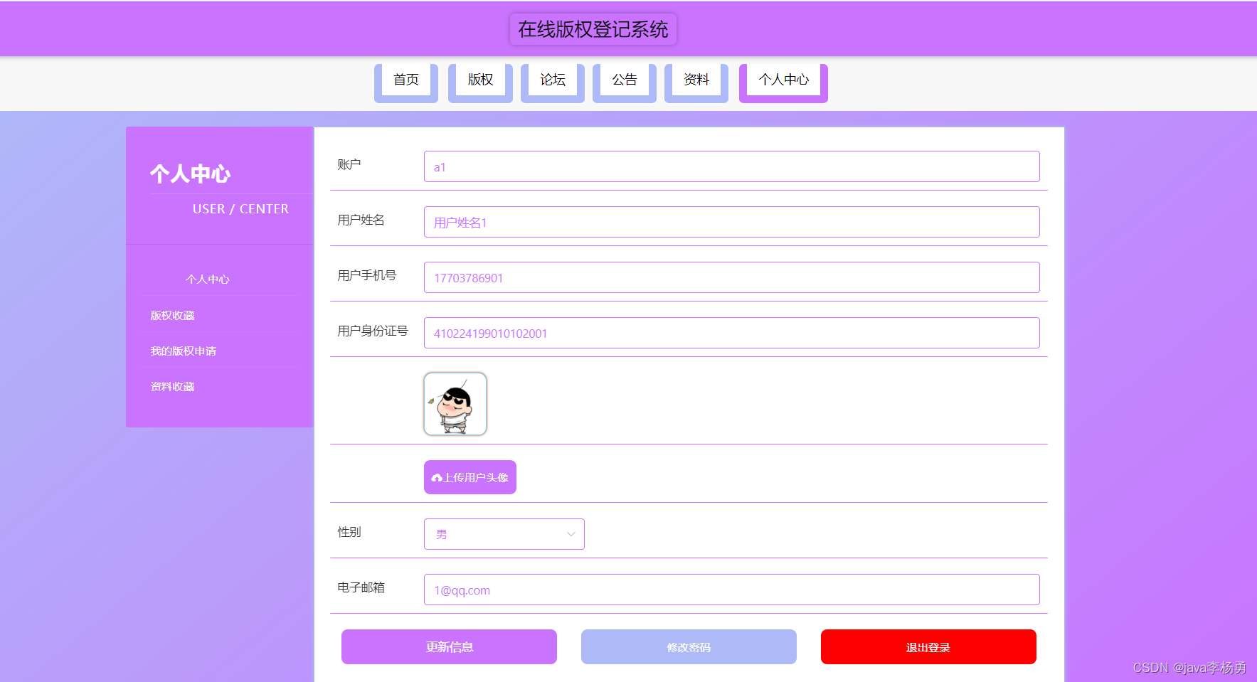 当下,许多行业采用互联网技术将工作流程信息化、数字化,提高了相关人员的服务质量和效率,节约了相关行业的人力、财力、物力等资源,与此同时,人们获取外界的相关信息主要依赖于主流的信息化技术和工具。人们对生活的需求也在不断的发生着变化,为了应对用户的多样化需求,许多相关的第三产业应运而生,管理信息化也逐渐的流行起来,比如电子商务行业。本人通过查询大量学习资料,了解基本的开发系统的基本背景和关键任务,学习与掌握Java语言、web技术、AJAX技术、HTML语言等开发技术,设计系统功能模块,以及MySQL数据库的相关语法和工具,创建和存储数据表格,反映和关联表格之间相互存在的关系,由此对在线版权登记系统进行研发和实现。