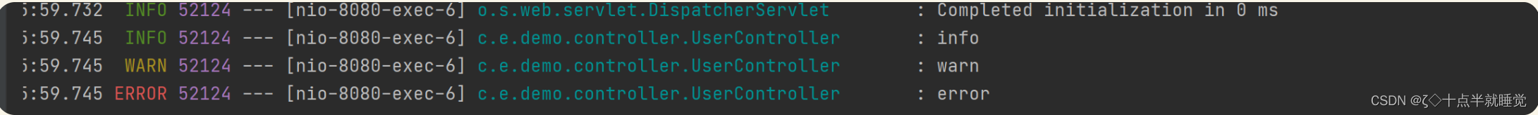 @Controller@ResponseBodypublic class UserController { private static final Logger log = LoggerFactory.getLogger(UserController.class); @RequestMapping("/sayhi") public void sayHi() { log.trace("trace"); log.debug("debug"); log.info("info"); log.warn("warn"); log.error("error"); }}