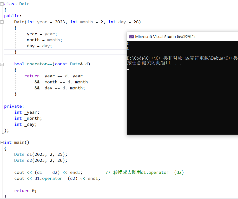 #include <iostream>class Date{public:Date(int year = 2003, int month = 10, int day = 24){std::cout << this << ": Date(int, int, int)" << std::endl;_year = year;_month = month;_day = day;}bool operator==(const Date& d){return _year == d._year&& _month == d._month&& _day == d._day;}bool operator!=(const Date& d){return !(*this == d);}Date& operator=(const Date& d){std::cout << this << ": Date& operator=(const Date& )" << std::endl;if (*this != d){_year = d._year;_month = d._month;_day = d._day;}return *this;}Date(Date& d){std::cout << this << ": Date(Date& d)" << std:: endl;_year = d._year;_month = d._month;_day = d._day;}void Print(){std::cout << _year << "年" << _month << "月" << _day << "日" << std::endl;}private:int _year;int _month;int _day;};int main(){Date d1(2023, 2, 27);// 构造d1.Print();Date d2 = d1; //拷贝构造d2.Print();Date d3(d2); //拷贝构造d3.Print();d3 = d1; //赋值重载d3.Print();Date d4 = d3 = d2; // 赋值重载 + 构造拷贝d4.Print();return 0;}