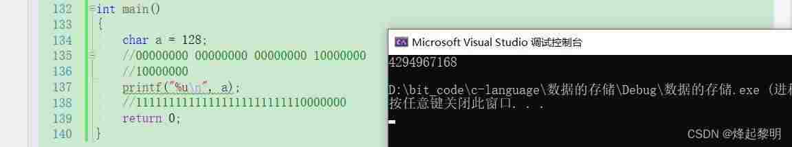 #include <stdio.h>int main(){ char a = 128; printf("%u\n",a); return 0;} 接下去我们来看第三道题,可以看出和上面那题基本基本一样,只是把-128变成了128而已如果是【128】的话放到内存中就不需要像负数那样还要进行很多的转化了,因为正数的原、反、补码都一致 00000000 00000000 00000000 10000000 同理进行截断操作后位为10000000,那后面就是一样的了 ,同上 运行结果如下: