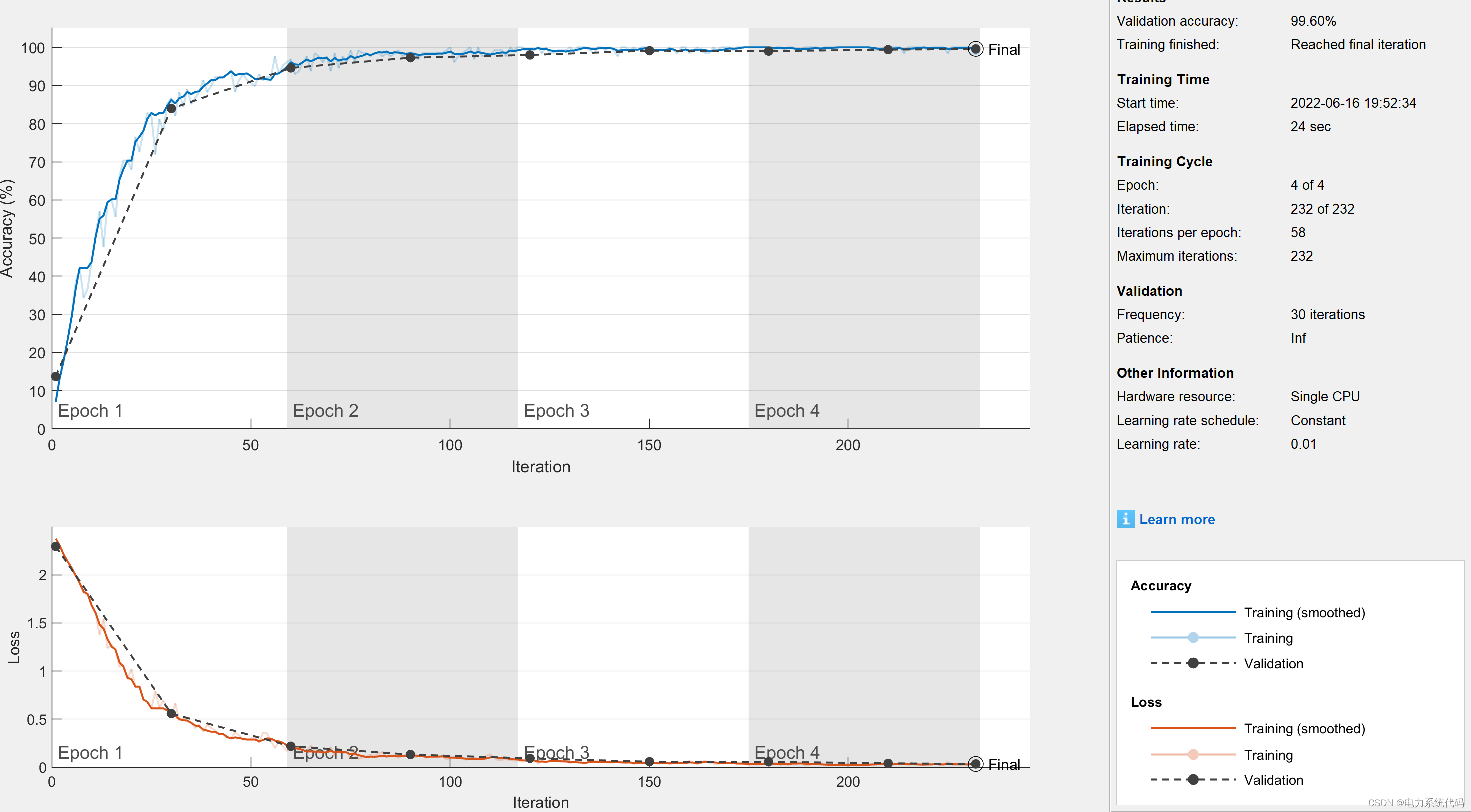 定义网络结构体后,指定训练选项。使用具有动量的随机梯度下降 (SGDM) 训练网络,初始学习率为 0.01。将最大训练轮数设置为 4。将数据分为训练集和测试集,对构建好的CNN进行训练,训练过程中的误差曲线如下: