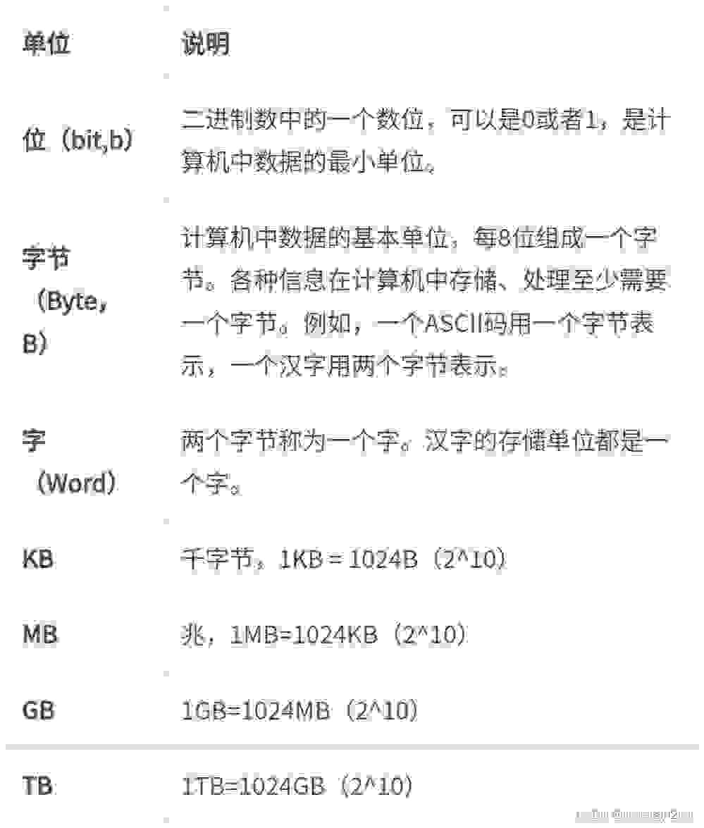 从图表中,我们可以看到,最小的存储单位为bit(位或者比特),即为二进制数所存储的位。比位大一点的单位为byte(字节),且1字节=8位。