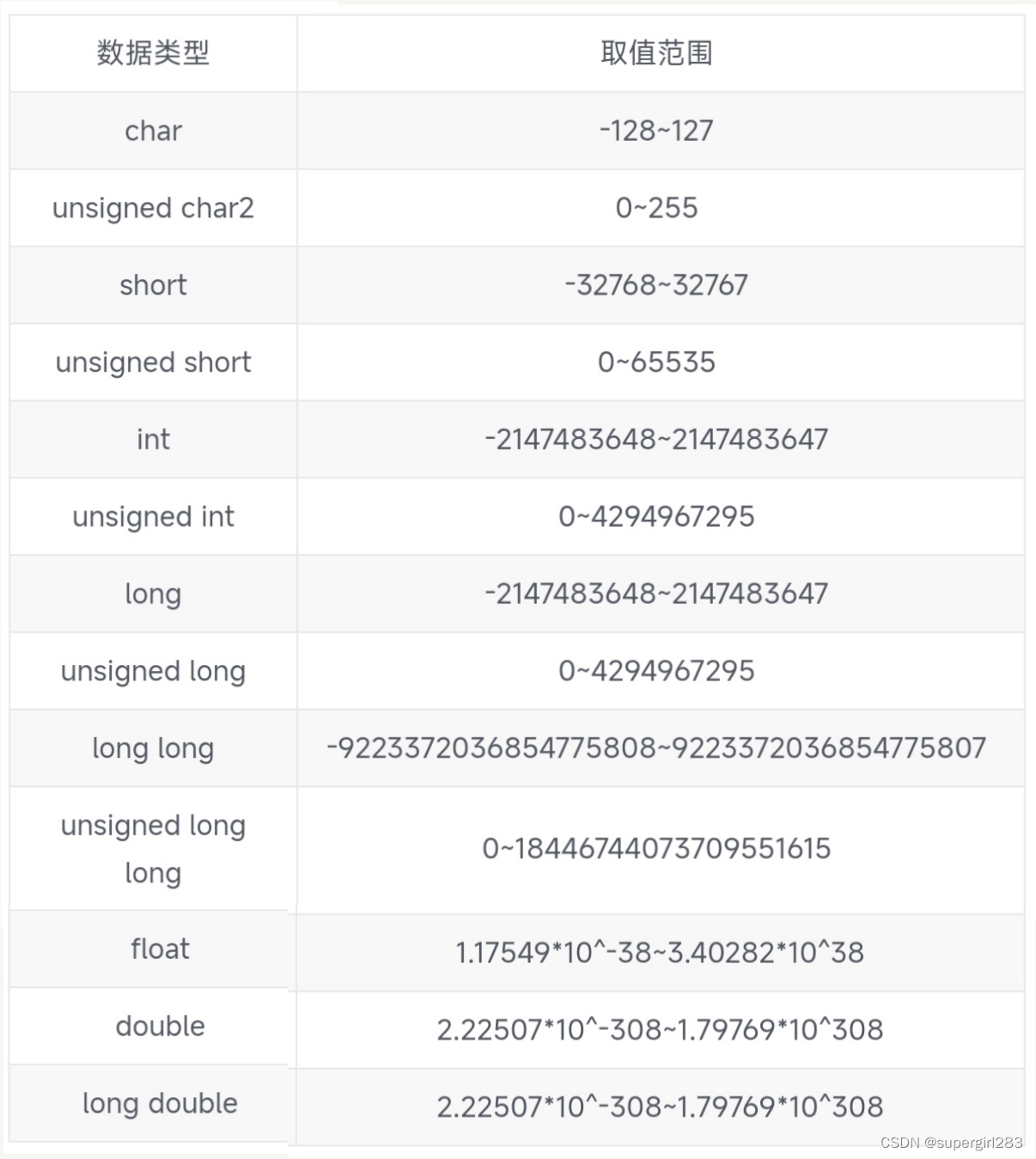 注:整型数据可在类型符号前面加修饰符:signed(有符号整数类型)和unsigned(无符号整数类型),若不指定则默认为“有符号类型”。