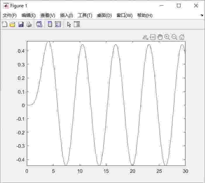 % 有复数极点的微分方程syms y(t) u(t); u=sin(t);uu=diff(u)+3*u;eqn=diff(y,5)+5*diff(y,4)+12*diff(y,3)+16*diff(y,2)+12*diff(y)+4*y==uu;y1=diff(y);y2=diff(y,2);y3=diff(y,3);y4=diff(y,4); % 需要引入中间变量cond=[y(0)==0,y1(0)==0,y2(0)==0,y3(0)==0,y4(0)==0];y=dsolve(eqn,cond);y=simplify(y)fplot(y,[0,30])% 检验diff(y,5)+5*diff(y,4)+12*diff(y,3)+16*diff(y,2)+12*diff(y)+4*y-uu 运行结果: