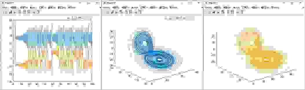 f=@(t,x) [-8/3*x(1)+x(2)*x(3);-10*x(2)+10*x(3);-x(1)*x(2)+28*x(2)-x(3)]% 编写匿名函数描述动态模型tn=100;x0=[0;0;1e-10];[t,x]=ode45(f,[0,tn],x0); %求方程数值解plot(t,x);figure;plot3(x(:,1),x(:,2),x(:,3)); %相空间轨迹三维图grid % 显示或隐藏坐标区网格线figure;comet3(x(:,1),x(:,2),x(:,3)); %绘制动画式轨迹 运行结果: