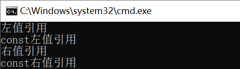 void Func(int& x) { cout << "左值引用" << endl; }void Func(const int& x) { cout << "const左值引用" << endl; }void Func(int&& x) { cout << "右值引用" << endl; }void Func(const int&& x) { cout << "const右值引用" << endl; }template<typename T>void PerfectForward(T&& t) // 万能引用{Func(std::forward<T>(t)); // 根据参数t的类型去匹配合适的重载函数}int main(){int a = 4; // 左值PerfectForward(a);const int b = 8; // const左值PerfectForward(b);PerfectForward(10); // 10是右值const int c = 13;PerfectForward(std::move(c)); // const左值被move后变成const右值return 0;} 运行结果如下: