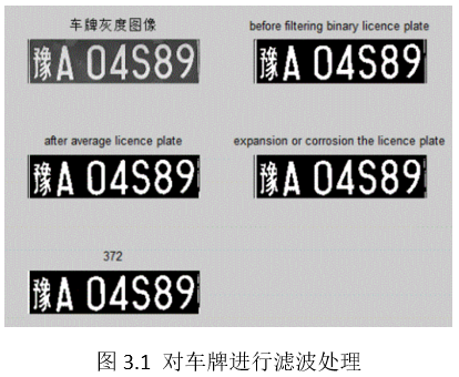 对分割出的彩色车牌图像进行灰度转换、二值化、均值滤波、腐蚀膨胀以及字符分割以从车牌图像中分离出组成车牌号码的单个字符图像,对分割出来的字符进行预处理(二值化、归一化),然后分析提取,对分割出的字符图像进行识别给出文本形式的车牌号码。