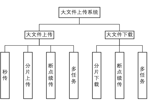系统总体功能图如图4所示,分为上传和下载。上传包括秒传,分片上传,断点续传,多任务。下载包括分片下载,断点续传,多任务。