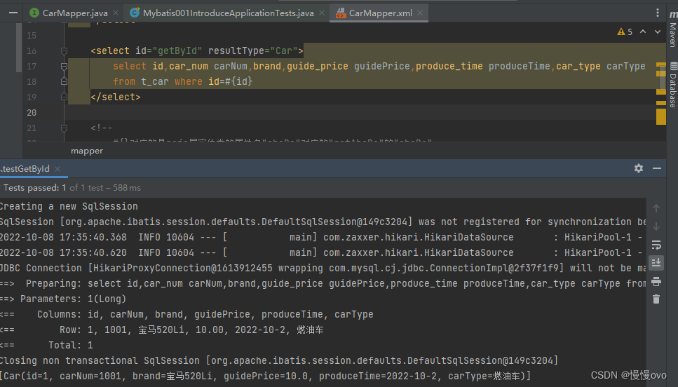 @Mapper public interface CarMapper { /** * 插入汽车 * @return * @param car */ int insert(Car car); /** * 按id删除车辆信息 * @param id * @return */ int delete(Long id); /** * 更新车辆信息 * @param car * @return */ int update(Car car);} <!--namespace和里面标签的id两者都是为了动态代理而需要的--><mapper namespace="com.chf.mapper.CarMapper"> <!-- #{}对应的是pojo层实体类的属性名"abcDe"对应的"getAbcDe"的"abcDe"(驼峰命名规范) 想简单点,对应属性名就行,复杂可能会乱ovo --> <insert id="insert"> insert into t_car(id,car_num,brand,guide_price,produce_time,car_type) values(null,#{carNum},#{brand},#{guidePrice},#{produceTime},#{carType}) </insert> <!--如果占位符只有一个,其实可以随便写里面的内容但不能不写,但最好见名知意,这次只是测试--> <delete id="delete"> delete from t_car where id = #{dasdad} </delete> <update id="update"> update t_car set car_num=#{carNum}, brand=#{brand}, guide_price=#{guidePrice}, produce_time=#{produceTime}, car_type=#{carType} where id=#{id} </update></mapper> @SpringBootTestpublic class Mybatis001IntroduceApplicationTests { @Autowired private CarMapper carMapper; @Test void testInsert(){ Car car = new Car(null,"111","奔驰",30.00,"2022-10-2","新能源"); int count = carMapper.insert(car); System.out.println((count == 1 ? "插入成功" : "插入失败")); } @Test void testDelete(){ int count = carMapper.delete(4L); System.out.println((count == 1 ? "删除成功" : "删除失败")); } @Test void testUpdate(){ Car car = new Car(6L,"1111","奔驰",30.00,"2022-10-2","新能源"); int count = carMapper.update(car); System.out.println((count == 1 ? "更新成功" : "更新失败")); }} 四、查询