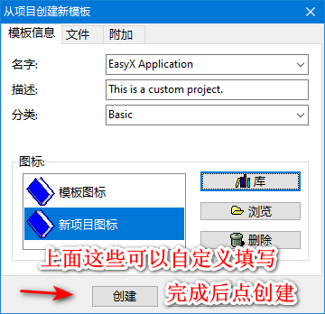 点击文件-->新建-->模板,填写模版名称:EasyX Application(这里按自己意愿),其他选项可以根据自己喜好填写。如下图: