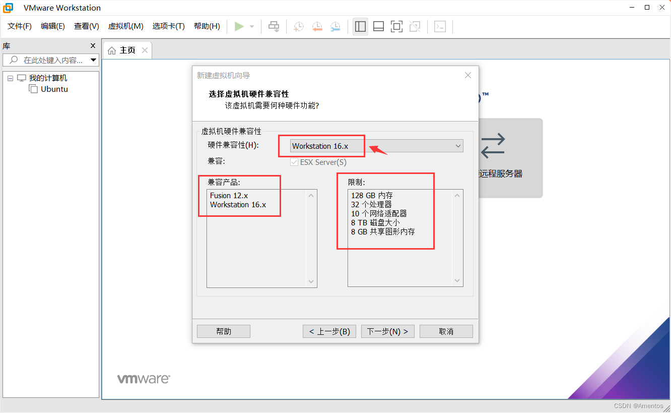 (系统会显示与你的选择相兼容的 VMware 产品及版本的列表,以及你的选择所具有的限制和不可用的功能)