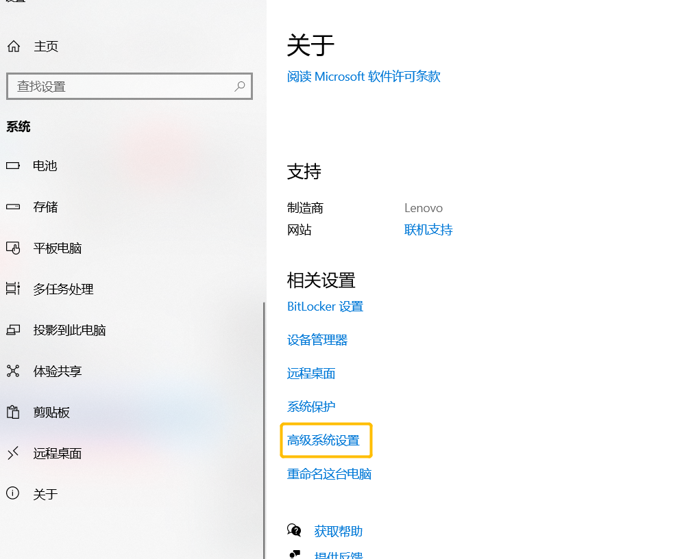 右键此电脑,点击设置,进入设置界面,找到高级系统设置,点击进入。