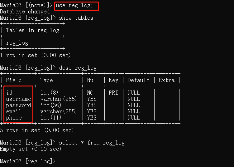 为了实现注册业务,我们在数据库中设计ID、用户名、密码、邮箱、电话号5个字段。
