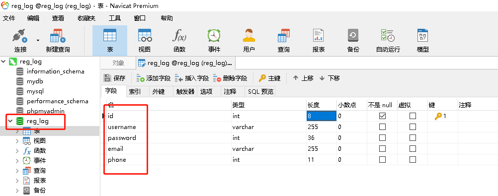 此处以Navicat软件进行创建,新建数据库reg_log.sql与数据表reg_log;