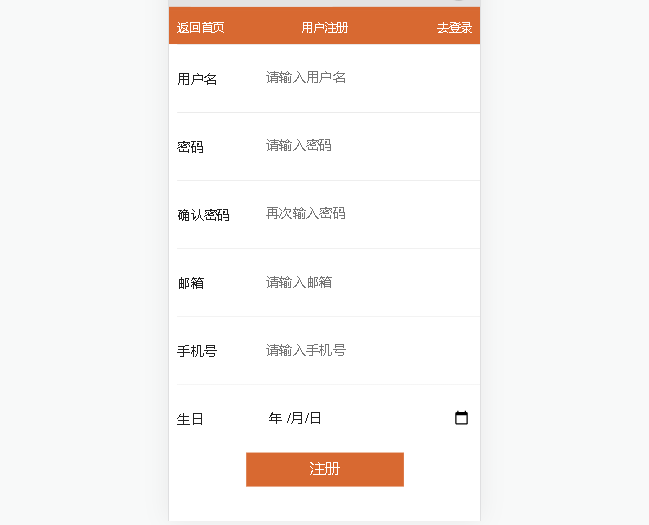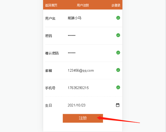 <template><!-- 注册页面 --> <div class="reg"> <mt-header title="用户注册"> <router-link slot="left" to="/"> 返回首页 </router-link> <router-link to="/login" slot="right">去登录</router-link> </mt-header> <mt-field type="text" label="用户名" placeholder="请输入用户名" v-model="name" :state="nameState" @blur.native.capture="checkName"></mt-field> <!-- @blur失焦,输入框在输入完成、移到其他地方时进行验证 --> <mt-field type="password" label="密码" placeholder="请输入密码" v-model="pwd" :state="pwdState" @blur.native.capture="checkPwd"></mt-field> <mt-field type="password" label="确认密码" placeholder="再次输入密码" v-model="repwd" :state="repwdState" @blur.native.capture="checkrePwd"></mt-field> <mt-field label="邮箱" placeholder="请输入邮箱" type="email" v-model="email" :state="emailState" @blur.native.capture="checkEmail"></mt-field> <mt-field label="手机号" placeholder="请输入手机号" type="tel" v-model="phone" :state="phoneState" @blur.native.capture="checkPhone"></mt-field> <mt-field label="生日" placeholder="请输入生日" type="date" v-model="birthday"></mt-field> <mt-button class="btn" type="primary" size="large" @click="checkForm">注册</mt-button> </div></template><style scope>.reg .btn { background-color: #d86931; width: 190px; border-radius: 0; border: 0; margin: auto;}.reg .mint-cell-wrapper { line-height: 80px;}.reg { margin-top: 14%;}.reg .mint-header { background-color: #d86931;}.reg .btn { background-color: #d86931;}</style><script>export default { data() { return { name: "", //双向数据绑定 用户名输入框 nameState: "", //处理用户名输入框的动态更新 pwd: "", pwdState: "", repwd: "", repwdState: "", email: "", emailState: "", phone: "", phoneState: "", birthday: "", }; }, methods: { // 封装各个字段的验证方法: // 1.验证用户名 checkName() { //事件处理函数:处理点击按钮验证表单 let reg = /^[a-zA-Z0-9\u4E00-\u9FA5]{2,6}$/; if (reg.test(this.name)) { this.nameState = "success"; return true; } else { this.nameState = "error"; return false; } }, // 2.验证密码 checkPwd() { let reg = /^\d{6}$/; if (reg.test(this.pwd)) { this.pwdState = "success"; return true; } else { this.pwdState = "error"; return false; } }, // 3.重复输入密码 checkrePwd() { let reg = /^\d{6}$/; if (reg.test(this.repwd) && this.pwd == this.repwd) { this.repwdState = "success"; return true; } else { this.repwdState = "error"; return false; } }, // 4.验证邮箱格式 checkEmail() { let reg = /^([a-zA-Z]|[0-9])(\w|\-)+@[a-zA-Z0-9]+\.([a-zA-Z]{2,4})$/; if (reg.test(this.email)) { this.emailState = "success"; return true; } else { this.emailState = "error"; return false; } }, // 5.验证手机号 checkPhone() { let reg = /^1[3|5|7|8][0-9]\d{8}$/; if (reg.test(this.phone)) { this.phoneState = "success"; return true; } else { this.phoneState = "error"; return false; } }, checkForm() { // 点击注册按钮后调用此方法,验证用户名、密码、二次密码是否均正确,正确则发送axios请求 if (this.checkName() && this.checkPwd() && this.checkrePwd()) { console.log(`验证成功,执行注册业务......`); // 发送注册(post)请求 this.axios .post("/register", `username=${this.name}&password=${this.pwd}`) .then((result) => { console.log(result); if (result.data.code == 200) { // 弹窗提示注册成功 this.$toast({ message: "注册成功", position: "bottom", duration: 3000, }); // 注册成功后直接跳转到登录页 this.$router.push("/login"); } else if (result.data.code == 201) { this.$toast({ message: "用户已存在,请重新注册", position: "bottom", duration: 3000, }); } }); } }, },};</script>