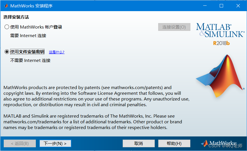 下载后,首先,打开 2018b64(中文版).zip ,然后打开 R2018b_win64文件夹 ,解压 setup.exe 后,如下图:点击 使用文件安装密钥 ,点击 下一步 。